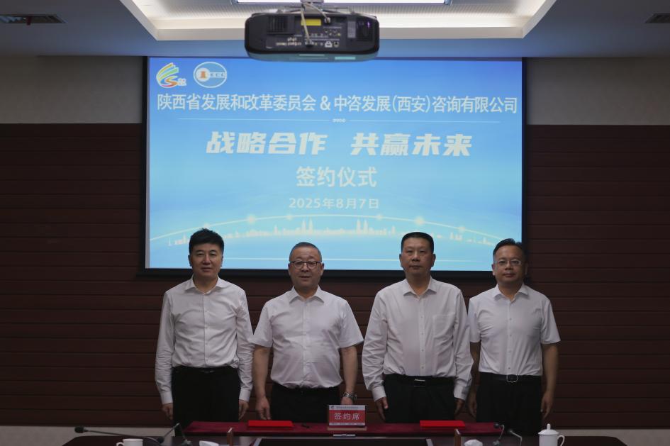 2025年8月7日,中咨發(fā)展(西安)咨詢有限公司(簡(jiǎn)稱中咨西安公司)與陜西省發(fā)展改革委簽署戰(zhàn)略合作協(xié)議,致力于創(chuàng)新構(gòu)建全鏈條咨詢服務(wù)體系,助推陜西在新時(shí)代西部大開(kāi)發(fā)中更好發(fā)揮示范作用。中咨公司黨委委員、副總經(jīng)理潘小海與陜西省發(fā)展改革委主任王青峰、陜西省工程咨詢協(xié)會(huì)會(huì)長(zhǎng)張堅(jiān)出席簽約儀式。中咨西安公司執(zhí)行董事、總經(jīng)理,中咨公司交通業(yè)務(wù)部副主任趙東與陜西省發(fā)展改革委黨組成員、副主任溫志剛代表雙方簽署協(xié)議。雙方舉行座談交流。