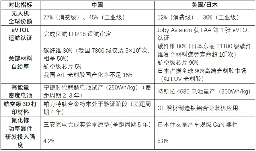 對比我國與美國、日本低空制造領(lǐng)域相關(guān)指標可以看出,盡管中國在市場規(guī)模、部分材料資源上占優(yōu),但在高端材料、動力電池、芯片等核心領(lǐng)域與國際領(lǐng)先水平相比仍有一定差距,亟需以“技術(shù)-政策-資本”三軸聯(lián)動加快材料升級,突破“卡脖子”難題,保障我國低空經(jīng)濟發(fā)展自主保障能力。